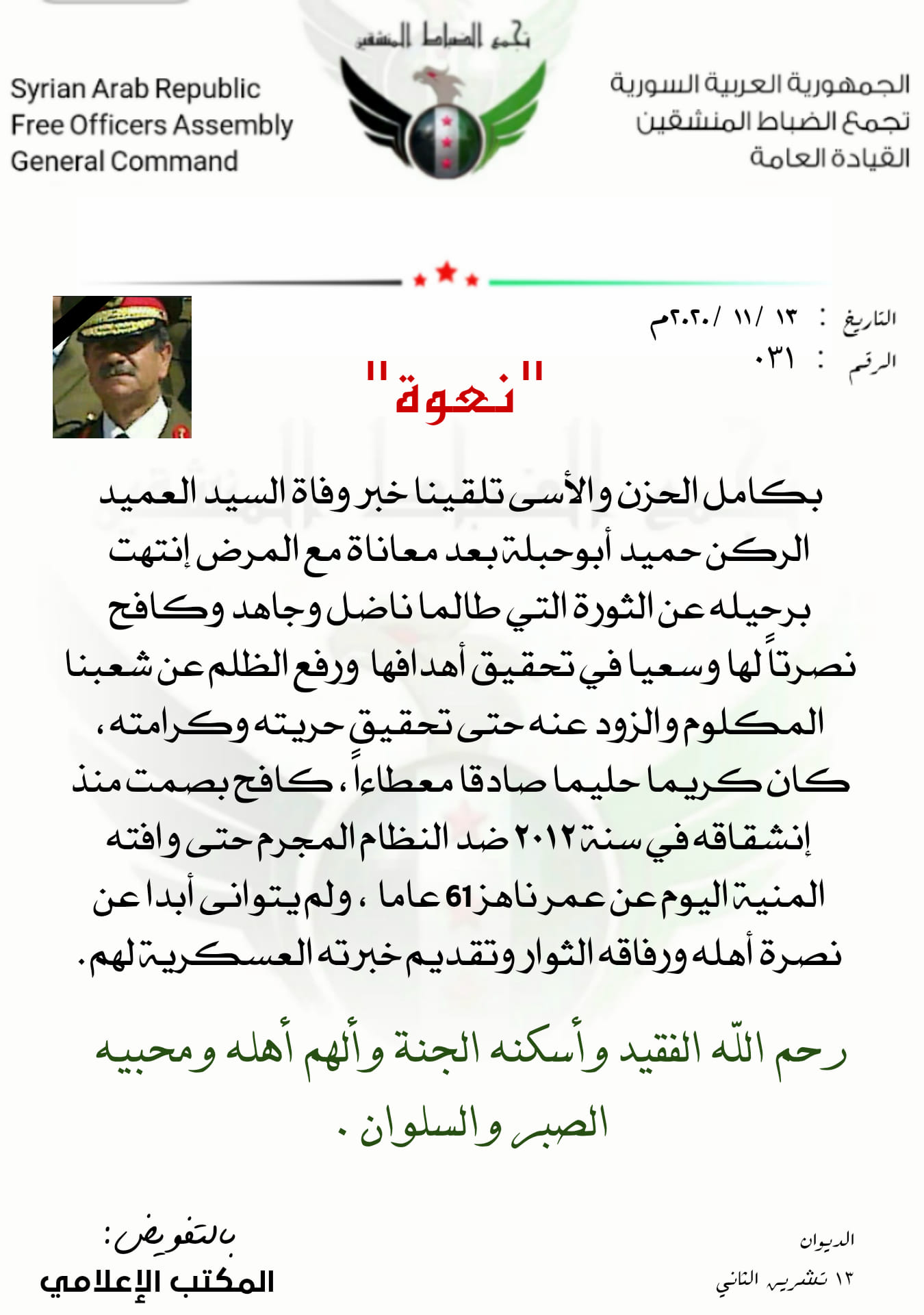 بيان من تجمع الضباط المنشقين "المبادرة الوطنية" تعزي فيه بوفاة العميد حميد أبو حبلة