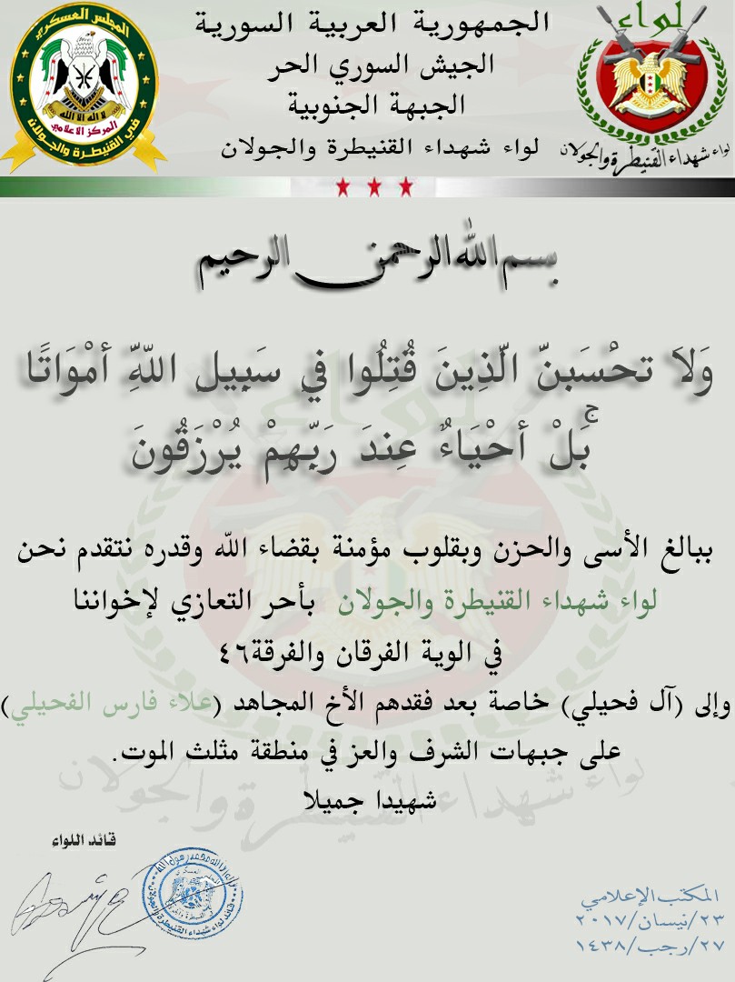 بيان من لواء شهداء القنيطرة والجولان يعزي فيه الفرقة 46 وألوية الفرقان بالمجاهد علاء فارس الفحيلي