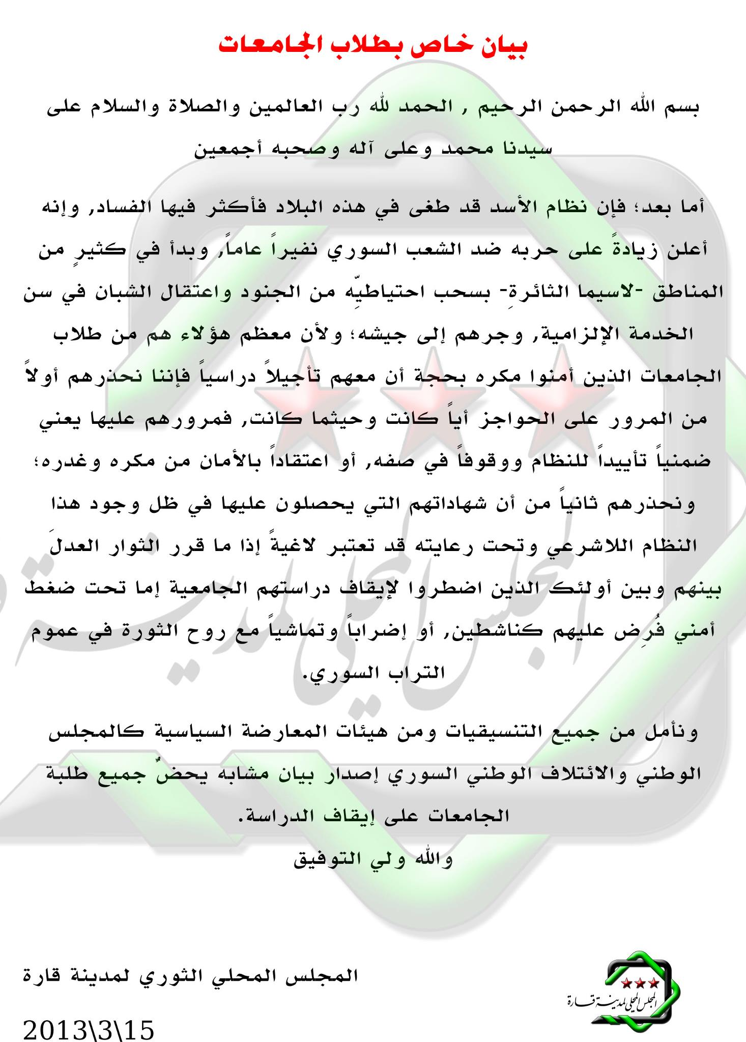أما بعد؛ فإن نظام الأسد قد طغى في هذه البلاد فأكثر فيها الفساد, وإنه أعلن زيادةً على حربه ضد الشعب السوري نفيراً عاماً, وبدأ في كثيرٍ من المناطق -لاسيما الثائرةِ- بسحب احتياطيِّه من الجنود واعتقال الشبان في سن الخدمة الإلزامية, وجرهم إلى جيشه؛ ولأن معظم هؤلاء هم من طلاب الجامعات الذين أمنوا مكره بحجة أن معهم تأجيلاً دراسياً فإننا نحذرهم أولاً من المرور على الحواجز أياً كانت وحيثما كانت, فمرورهم عليها يعني ضمنياً تأييداً للنظام ووقوفاً في صفه, أو اعتقاداً بالأمان من مكره وغدره؛ ونحذرهم ثانياً من أن شهاداتهم التي يحصلون عليها في ظل وجود هذا النظام اللاشرعي وتحت رعايته قد تعتبر لاغيةً إذا ما قرر الثوار العدلَ بينهم وبين أولئك الذين اضطروا لإيقاف دراستهم الجامعية إما تحت ضغط أمني فُرِض عليهم كناشطين, أو إضراباً وتماشياً مع روح الثورة في عموم التراب السوري.