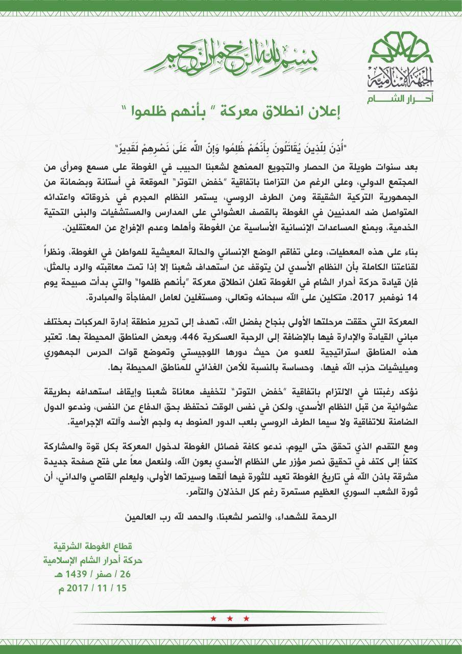 بيان حركة أحرار الشام عن إطلاق معركة "بأنهم ظلموا" في الغوطة