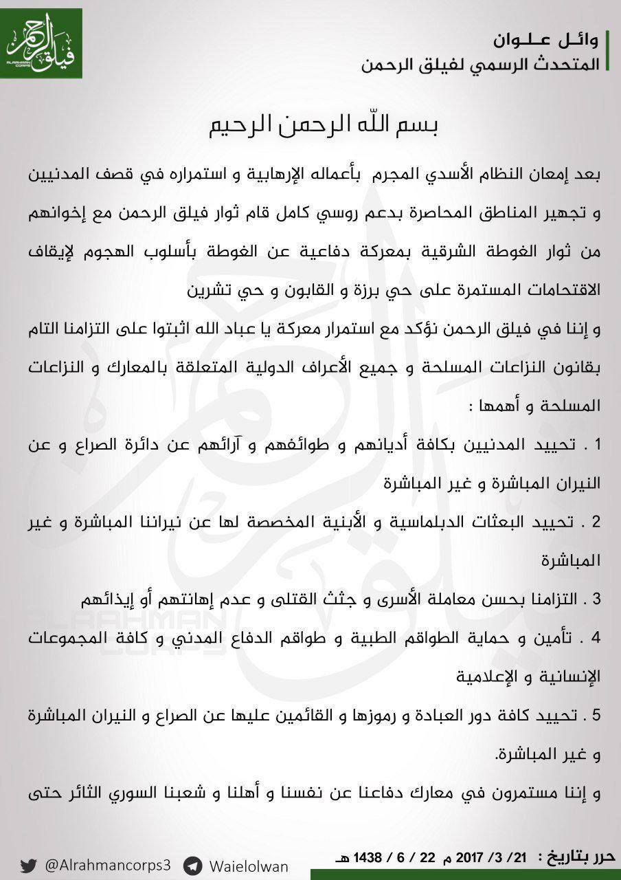 بيان من المتحدث الرسمي لفيلق الرحمن حول عملية يا عباد الله اثبتوا والالتزام بالأعراف والقوانين الدولية فيها