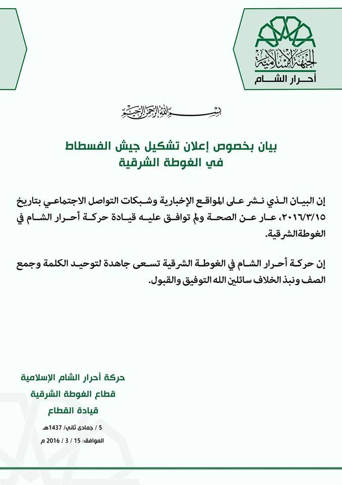 بيان حركة أحرار الشام الإسلامية يوضح ما نُشر على مواقع التواصل الاجتماعي بخصوص تشكيل جيش الفسطاط