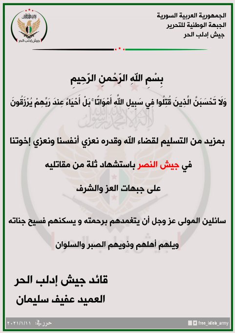 بيان من جيش إدلب الحر يعزي فيه جيش النصر بعدد من مقاتليه