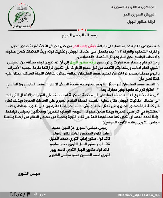 بيان من القيادة العامة لفرقة صقور الجبل تعلن فيه أن العقيد عفيف سليمان غير ممثل لها واعتبار القرارات التي اتخذها لاغية وتطالب بمحاكمته