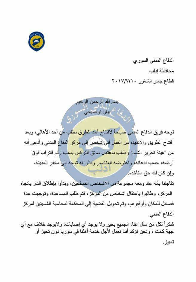 بيان توضيحي من الدفاع المدني حول حادثة تهديد أعضائه بالسلاح من قبل عناصر هيئة تحرير الشام قرب جسر الشغور