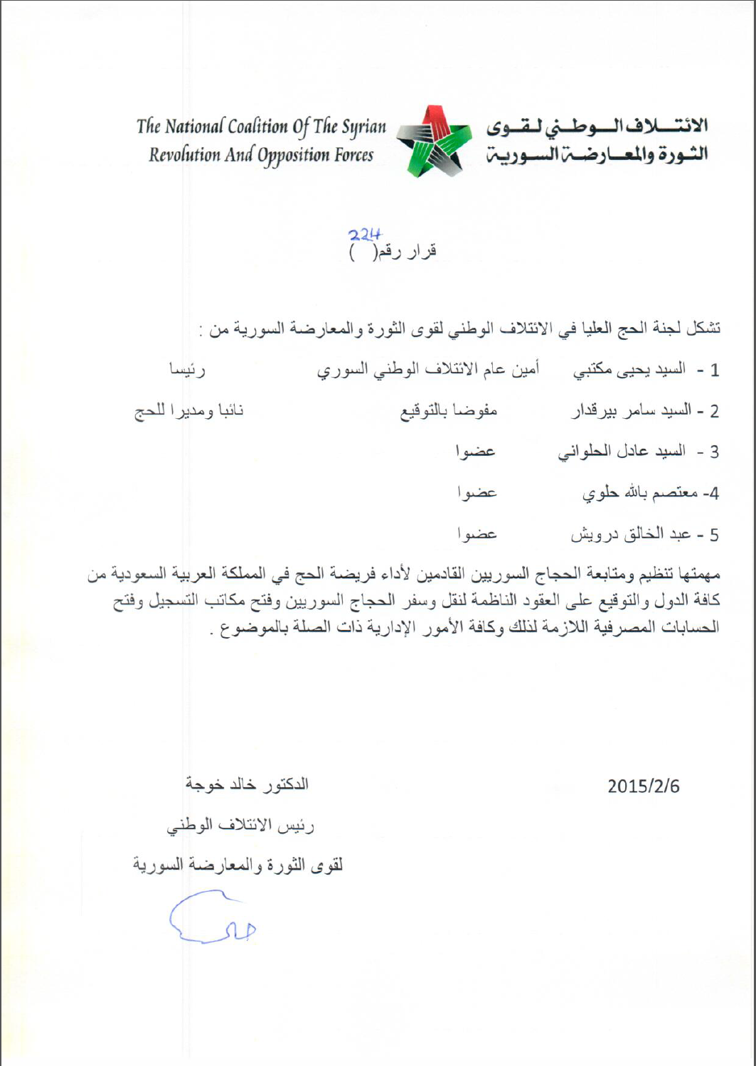 تشكل لجنة الحج العليا في الائتلاف الوطني لقوى الثورة والمعارضة السورية من :