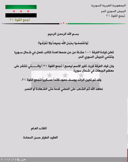بيان من تجمع القوة 21 تعلن فيه تعيين الرائد يوسف حمود قائداً عسكرياً للتجمع