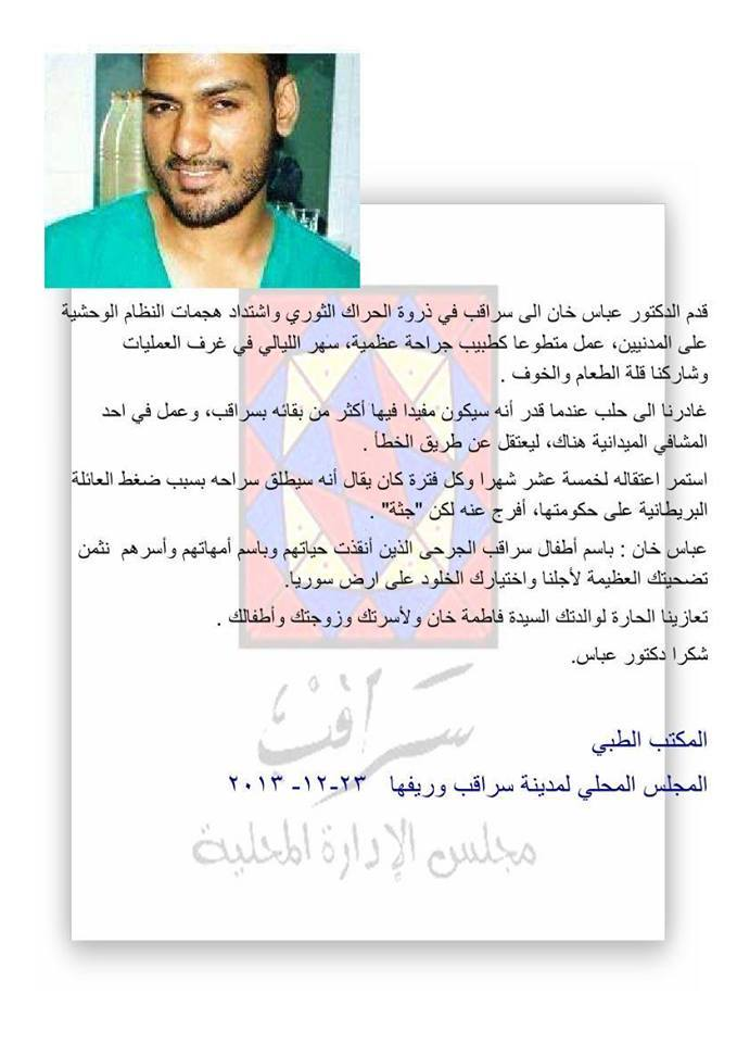 بيان تعزية في الطبيب البريطاني عباس خان من المجلس المحلي لمدينة سراقب