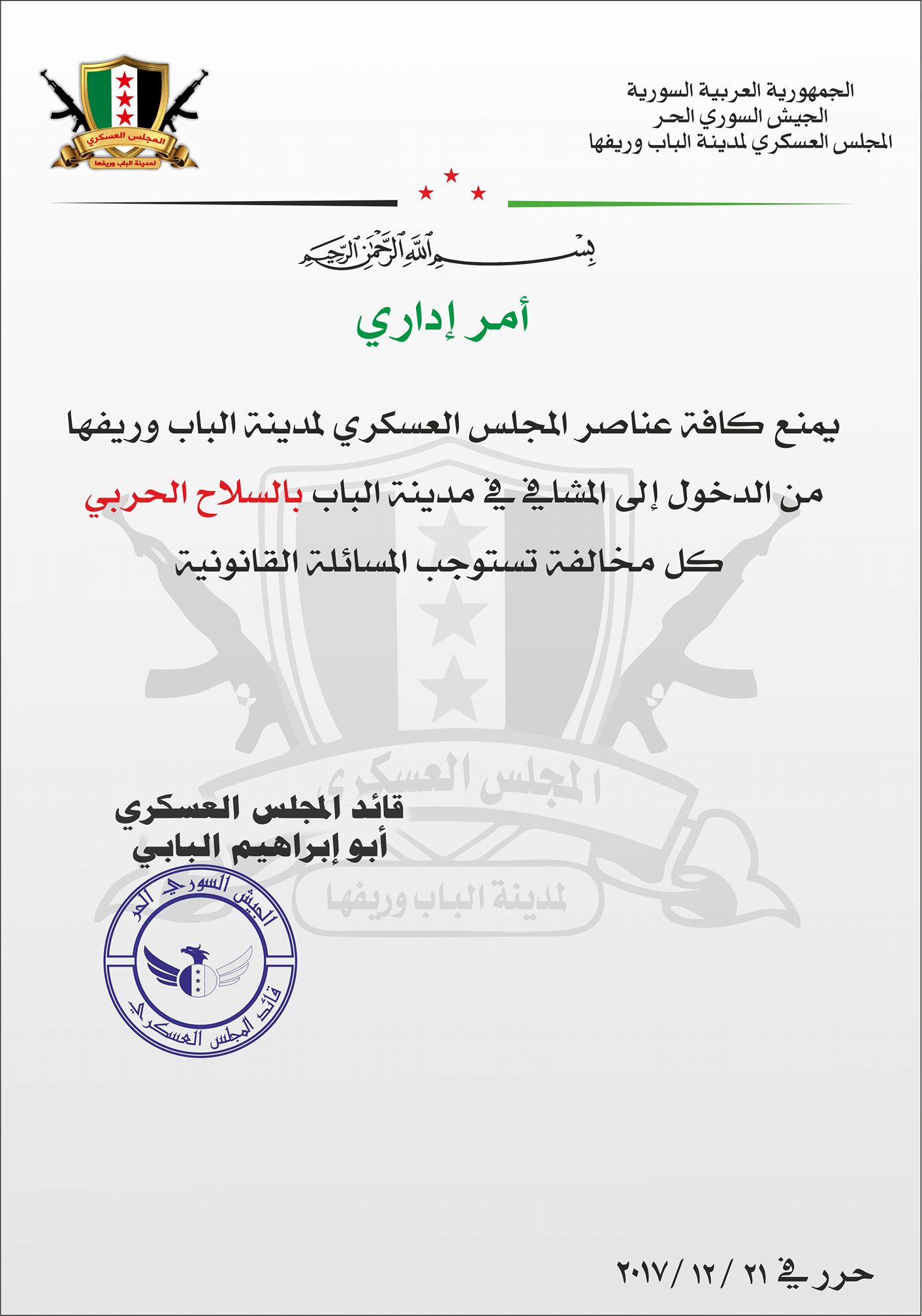 أمر إداري بمنع كافة عناصر المجلس العسكري لمدينة الباب وريفها بدخول المشافي بالسلاح الحربي