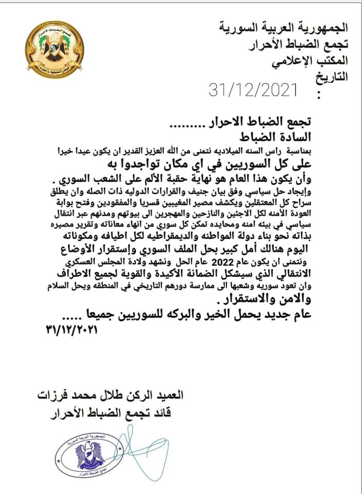 تجمع الضباط الاحرار يهنئ الشعب السوري برأس السنة الميلادية