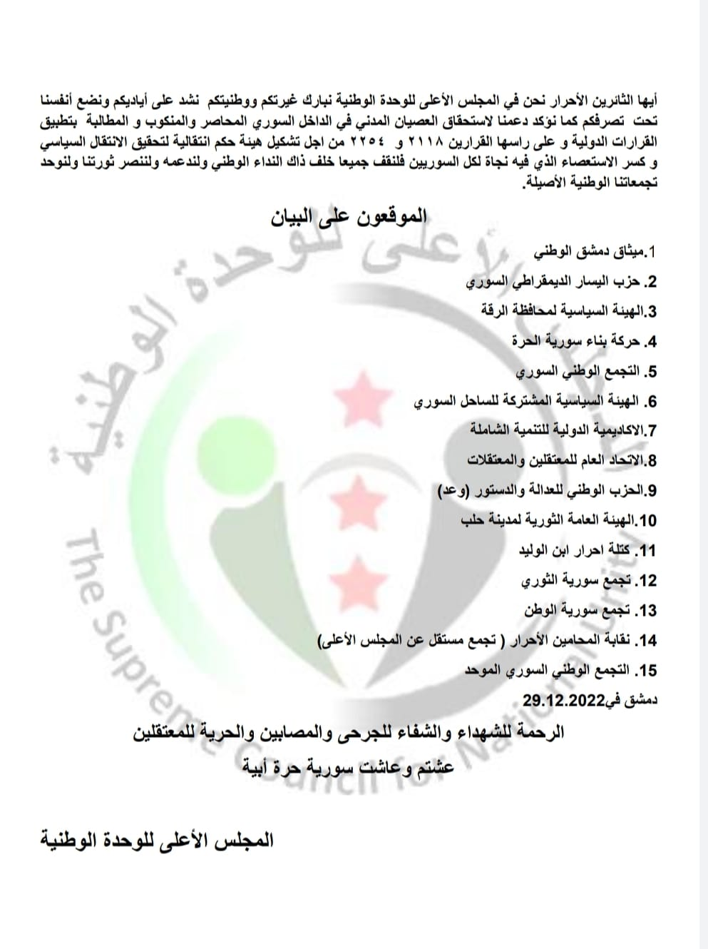 دعوة المجلس الأعلى للوحدة الوطنية لتشكيل هيئة حكم انتقالية ودعم العصيان المدني في الداخل السوري