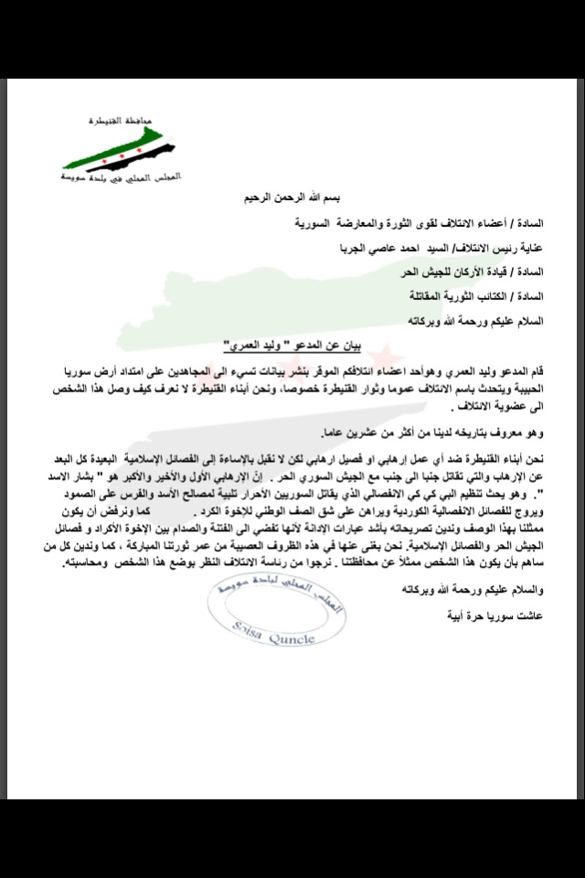 نحن أبناء القنيطرة ضد أي عمل إرهابي او فصيل ارهابي لكن لا نقبل بالإساءة إلى الفصائل الإسلامية البعيدة كل البعد عن الإرهاب والتي تقاتل جنبا الى جنب مع الجيش السوري الحر . إنّ الإرهابي الأول والأخير والأكبر هو " بشار الاسد ". وهو يحث تنظيم البي كي كي الانفصالي الذي يقاتل السوريين الأحرار تلبية لمصالح الأسد والفرس على الصمود ويروج للفصائل الانفصالية الكوردية ويراهن على شق الصف الوطني للإخوة الكرد . كما ونرفض أن يكون ممثلنا بهذا الوصف وندين تصريحاته بأشد عبارات الإدانة لأنها تفضي الى الفتنة والصدام بين الإخوة الأكراد و فصائل الجيش الحر والفصائل الإسلامية. نحن بغنى عنها في هذه الظروف العصيبة من عمر ثورتنا المباركة , كما وندين كل من ساهم بأن يكون هذا الشخص ممثلاً عن محافظتنا . نرجوا من رئاسة الائتلاف النظر بوضع هذا الشخص ومحاسبته.