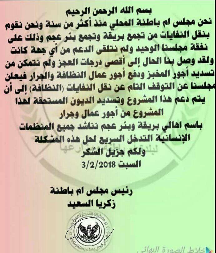 بيان من مجلس بلدية أم باطنة يعلن فيه عن توقفه عن نقل النفايات بسبب عجزه المالي