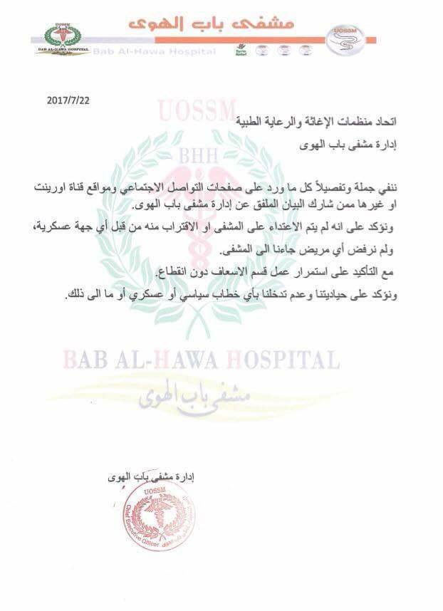 إن إدارة مشفى باب الهوى تنفي جملة وتفصيلاً كل ما ورد على صفحات التواصل الاجتماعي ومواقع قناة اورينت او غيرها ممن شارك البيان الملفق عن إدارة مشفى باب الهوى، ونؤكد على أنه لم يتم الاعتداء على المشفى او الاقتراب منه من قبل أي جهة عسكرية، ولم نرفض أي مريض جاءنا إلى المشفى، مع التأكيد على استمرار عمل قسم الاسعاف دون انقطاع.