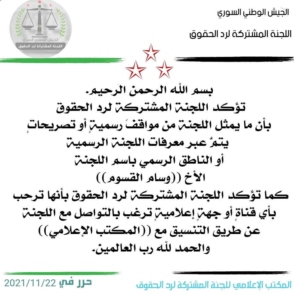 تؤكد اللجنة المشتركة لرد الحقوق بأن ما يمثل اللجنة من مواقفَ رسميةٍ أو تصريحاتٍ يتمُّ عبر معرفات اللجنة الرسمية أو الناطق الرسمي باسم اللجنة الأخ