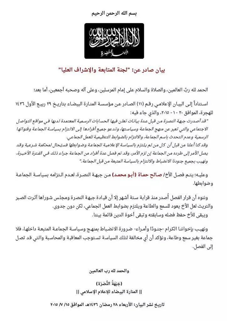 بيان لجنة المتابعة والإشراف العليا في جبهة النصرة بفصل صالح حماة (أبو محمد) من الجبهة