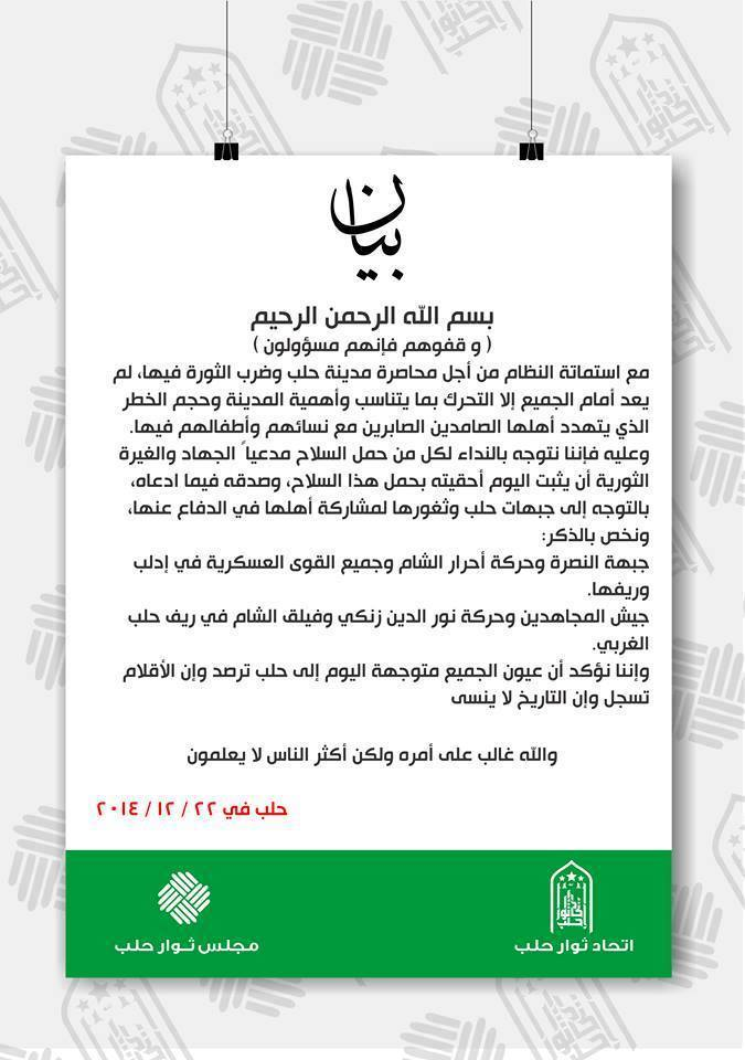 بيان من اتحاد ثوار حلب ومجلس ثوار حلب يطالب الفصائل الكبرى بحلب بمواجهة النظام ومنعه من حصار المدينة