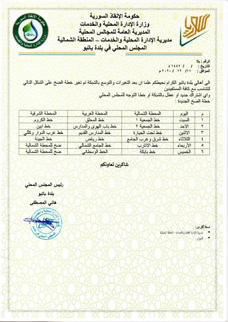 تعميم من المجلس المحلي في بلدة باتبو حول الخطة الشهرية الجديدة لضخ المياه بالشبكة