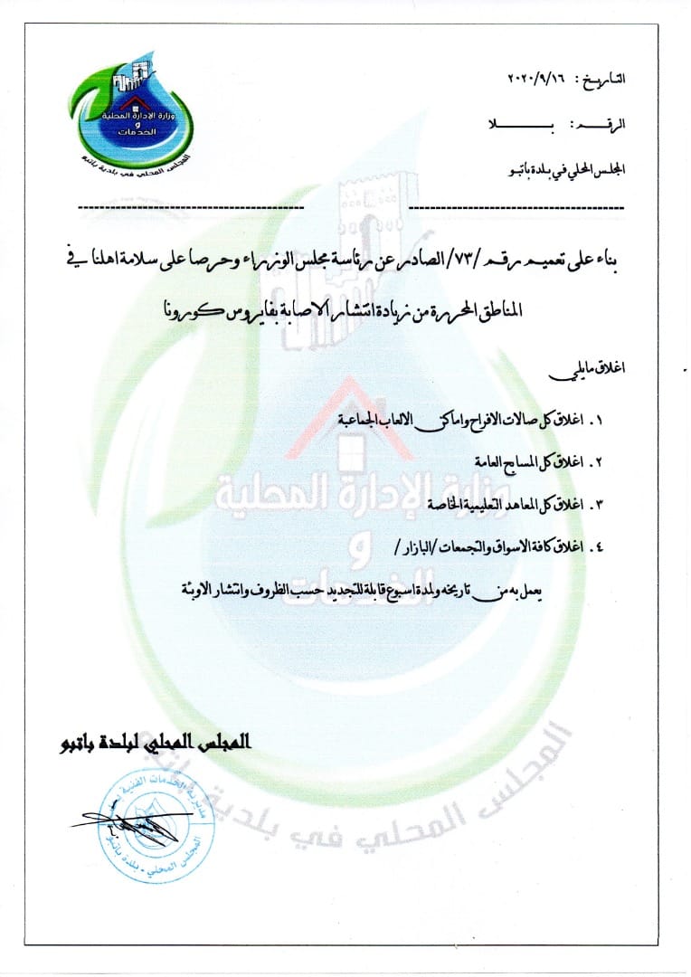 تعميم من المجلس المحلي بشأن اتخاذ بعض الإجراءات منعاً لتفشي فايروس كورونا