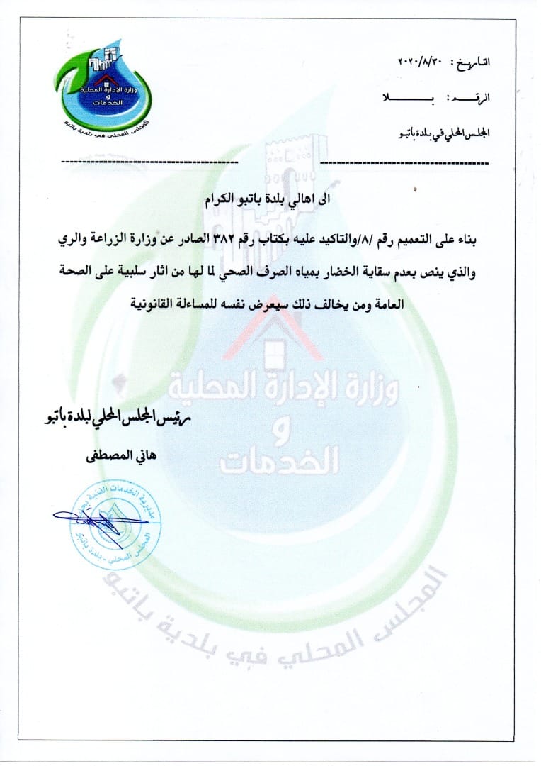 تعميم من المجلس المحلي بمنع سقاية الأراضي بمياه الصرف الصحي