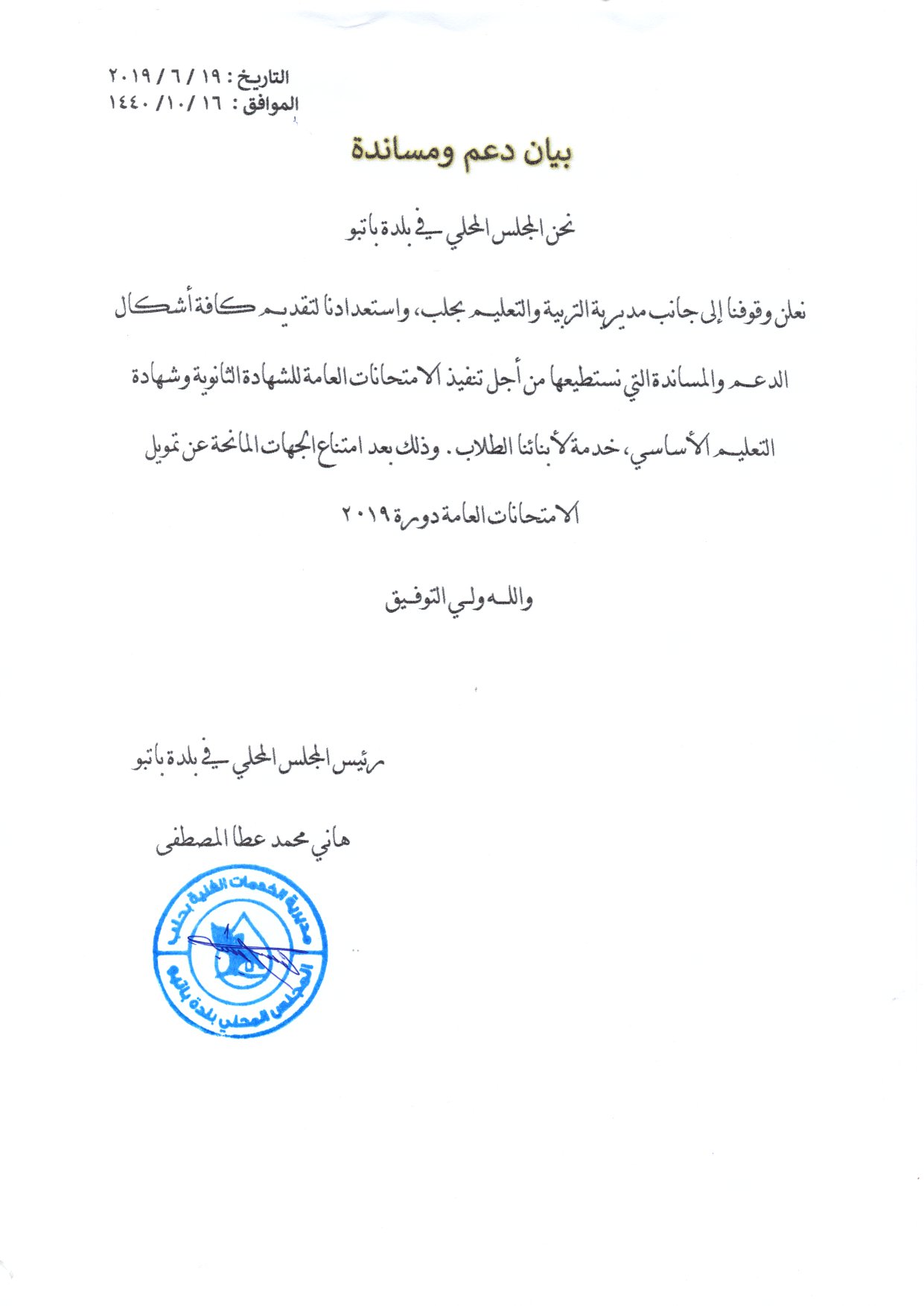 بيان من المجلس المحلي في بلدة باتبو يعلن فيه وقوفه إلى جانب مديرية التربية والتعليم بحلب