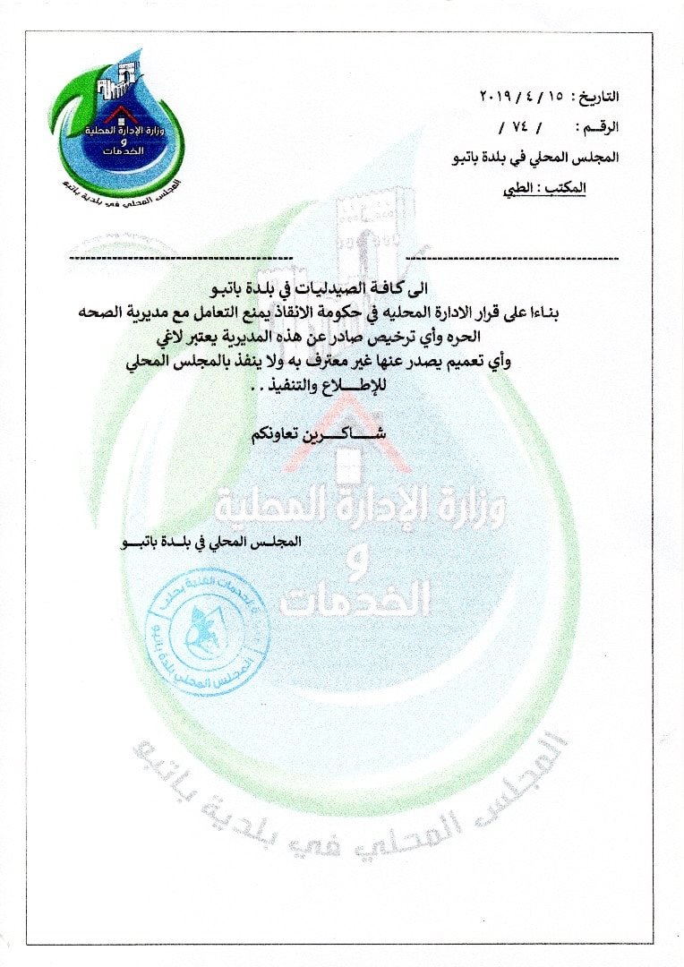 بنــــاءا على قرار الادارة المحليه في حكومة الانقاذ يمنع التعامل مع مديرية الصحه الحره وأي ترخيص صادر عن هذه المديرية يعتبر لاغي