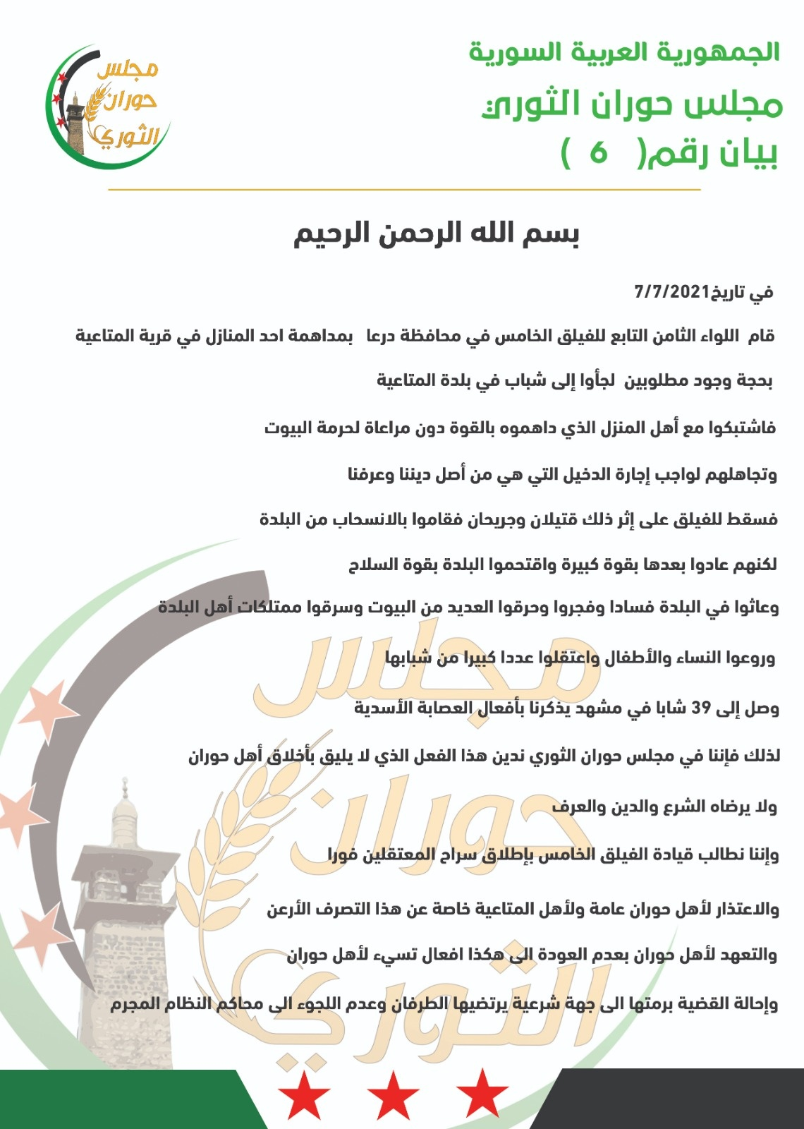 بيان إدانة من مجلس حوران الثوري لاقتحام اللواء الثامن التابع للفيلق الخامس لقرية المتاعية