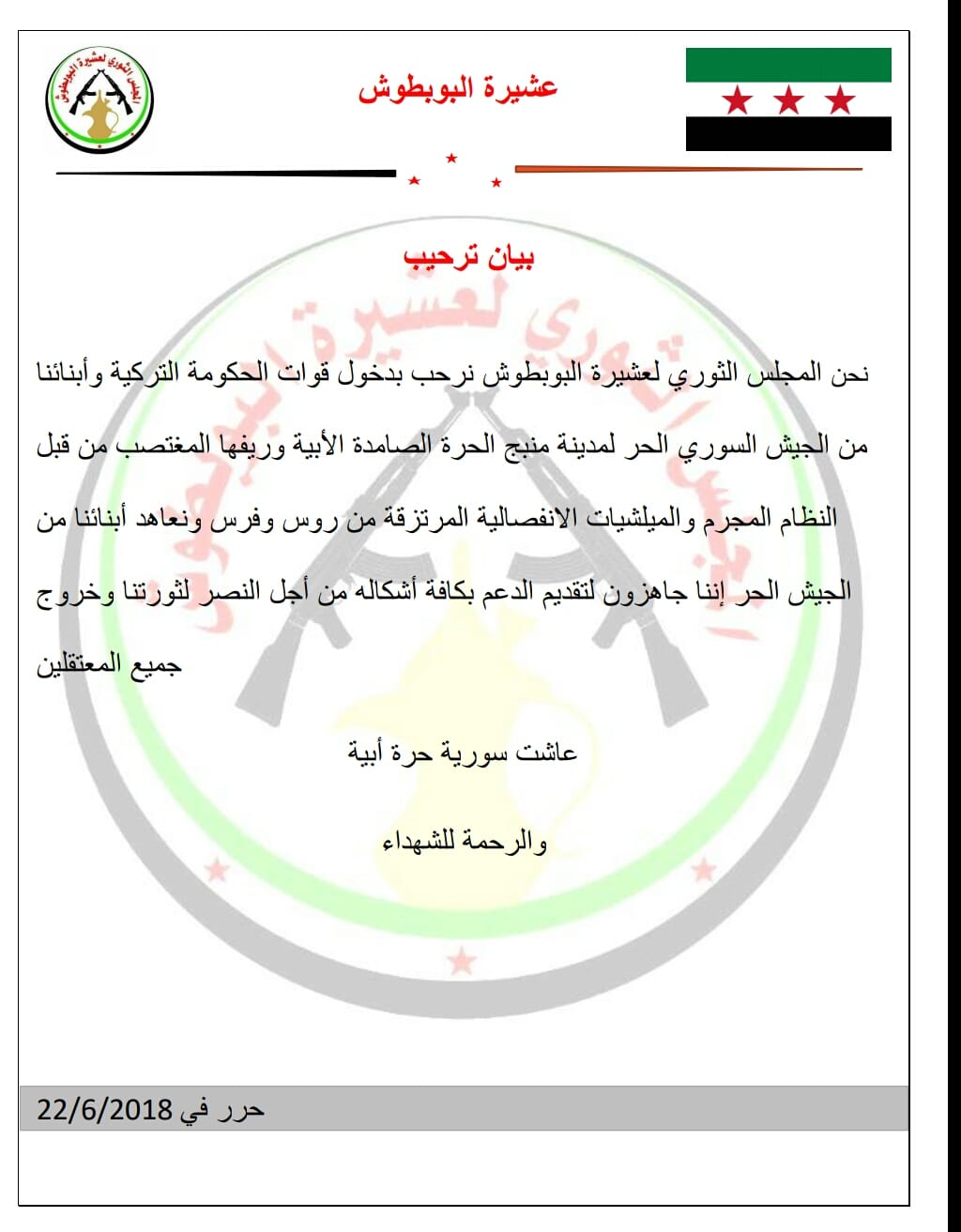 بيان ترحيب من المجلس الثوري لعشيرة البوبطوش بدخول الجيش الوطني السوري والجيش التركي لمدينة منبج وما حولها
