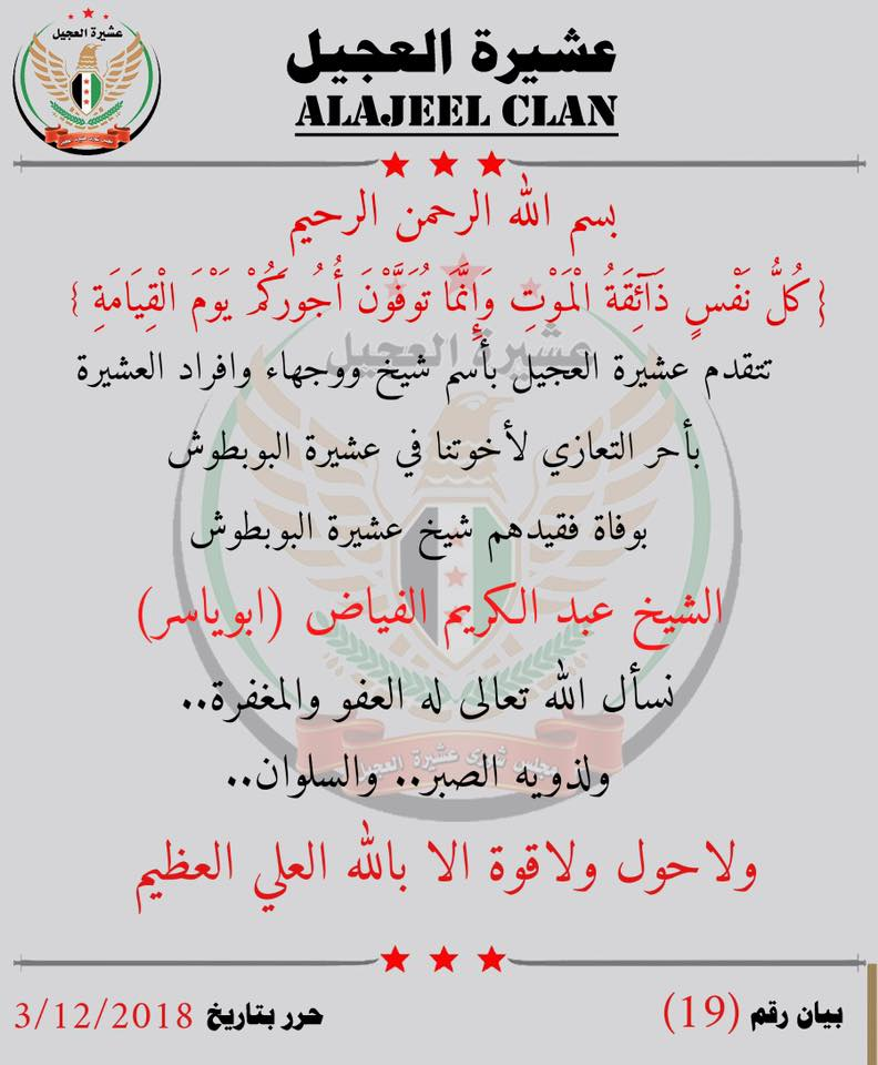 بيان من عشيرة العجيل يعزي بوفاة شيخ عشيرة البوبطوش