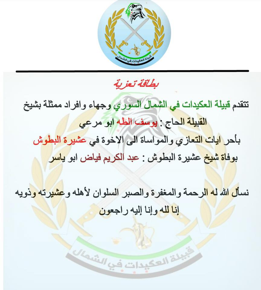 بيان تعزية من قبيلة العكيدات بوفاة شيخ عشيرة البوبطوش