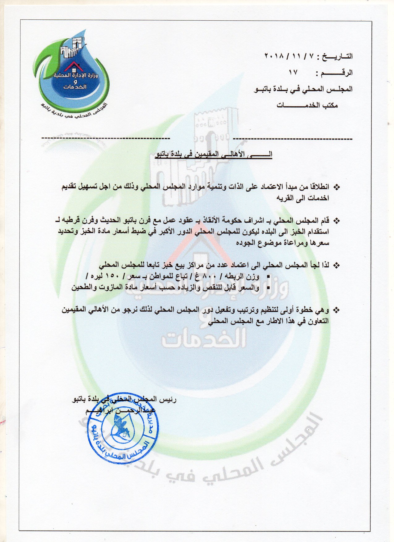 تعميم من المجلس المحلي حول قيامه بإجراء عقود عمل مع عدد من الأفران من أجل تحديد سعر مادة الخبز