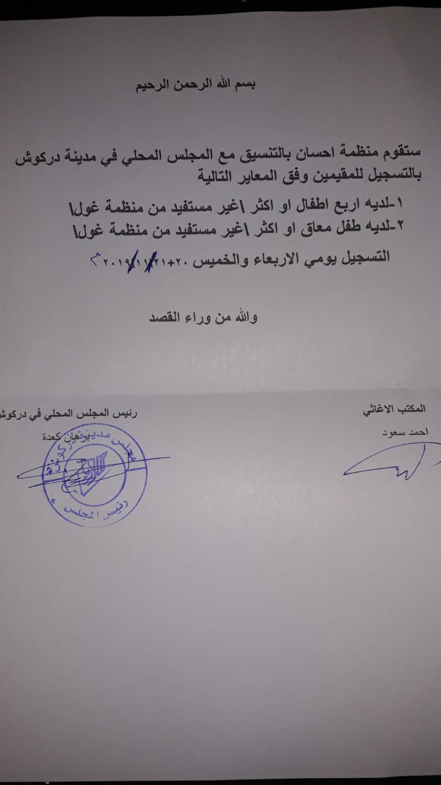 إعلان من المجلس حول قيام منظمة إحسان بالتسجيل للمقيمين وفق الشروط المحددة
