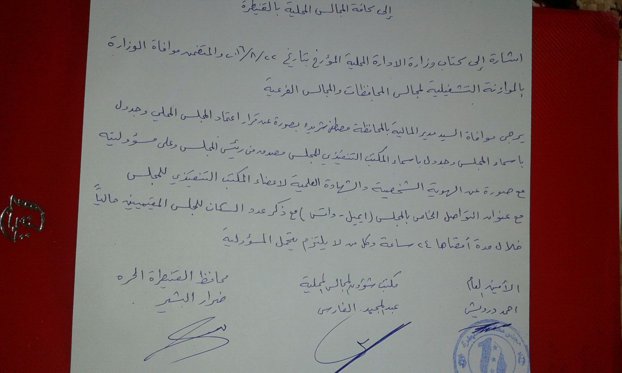 تعميم إداري من مجلس محافظة القنيطرة الحرة للمجالس المحلية التابعة له بضرورة إرسال بعض الوثائق