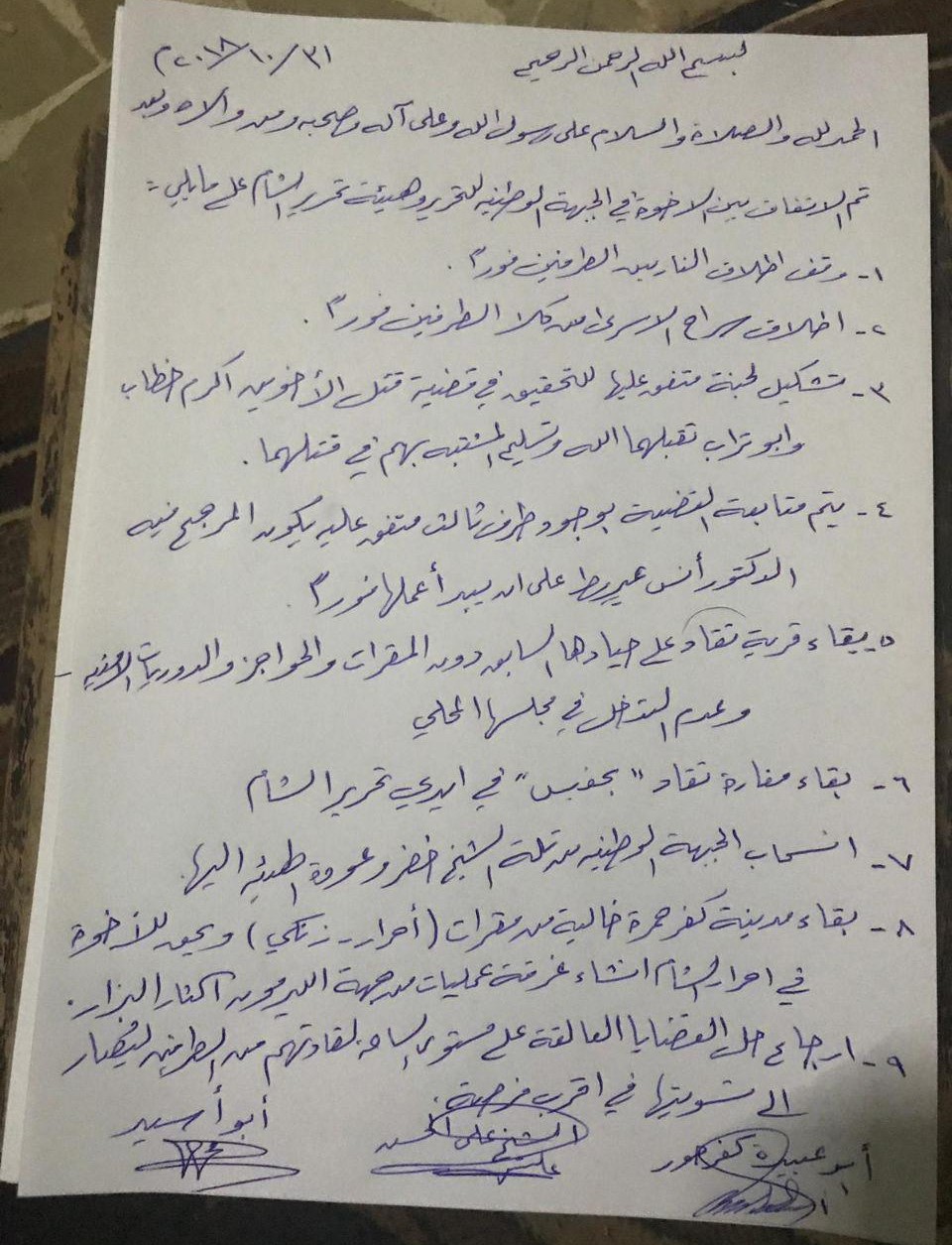 تم الاتفاق بين الأخوة في الجبهة الوطنية للتحرير وهيئة تحرير الشام على ما يلي: