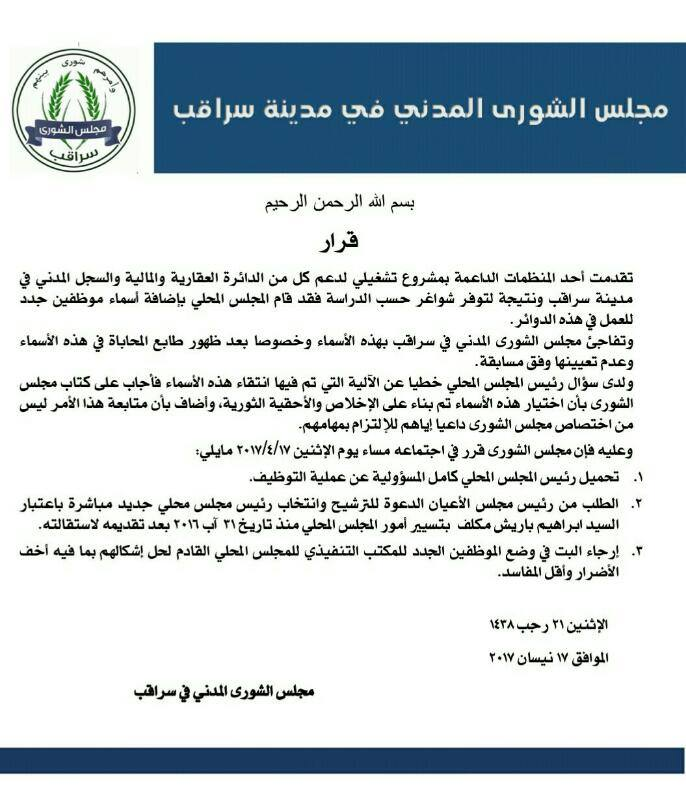 قرار مجلس الشورى المدني في سراقب برفض تعيين موظفين في عدد من الدوائر من قبل المجلس المحلي