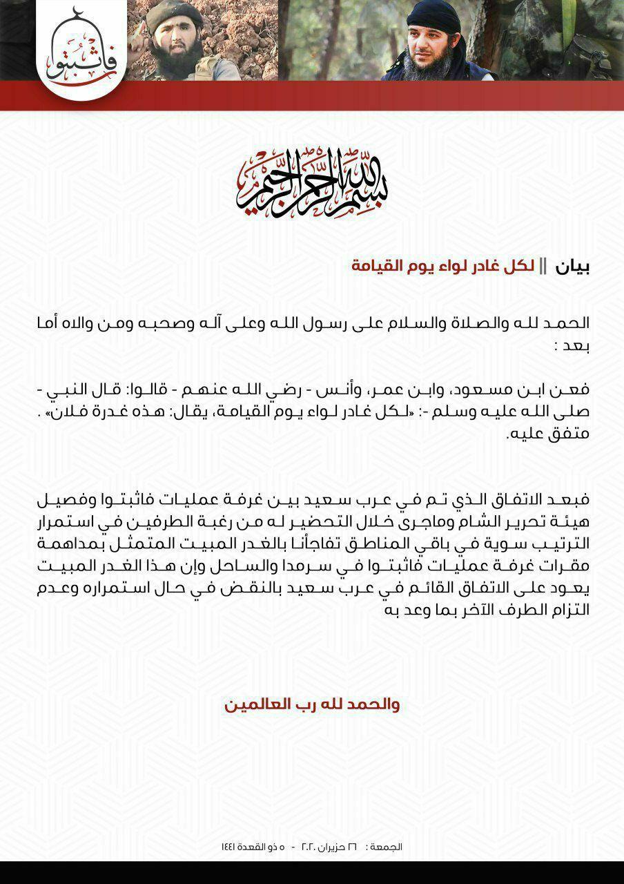 فبعد الاتفاق الذي تم في عرب سعيد بين غرفة عمليات فاثبتوا وفصيل هيئة تحرير الشام وما جرى خلال التحضير له من رغبة الطرفين في استمرار الترتيب سوية في باقي المناطق تفاجأنا بالغدر المبيت المتمثل بمداهمة مقرات غرفة عمليات فاثبتوا في سرمدا والساحل وإن هذا الفدر المبيت يعود على الاتفاق في عرب سعيد بالنقض في حال استمراره وعد التزام الطرف الآخر بما وعد به