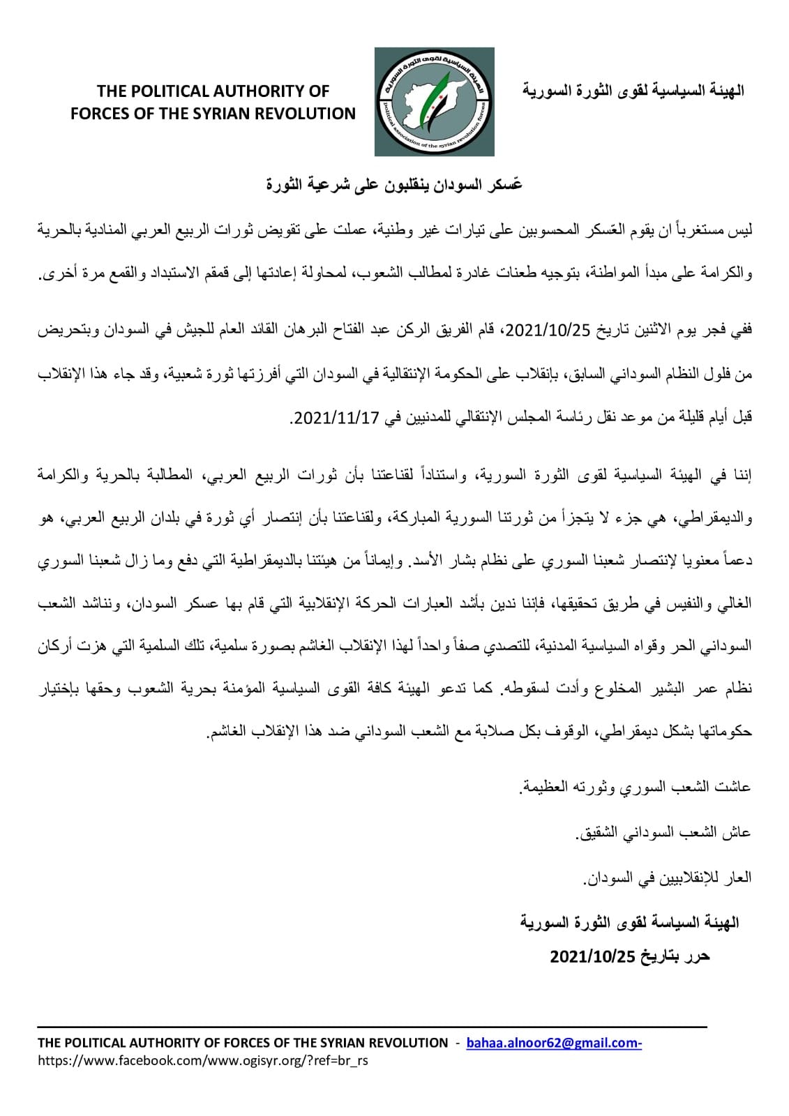 بيان الهيئة السياسية لقوى الثورة السورية "عسكر السودان ينقلبون على شرعية الثورة"