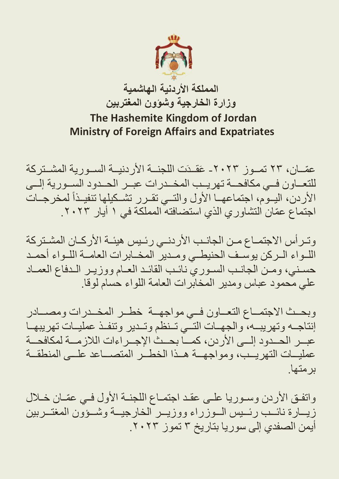 بيان الخارجية الأردنية حول اجتماع اللجنة الأمنية المشتركة مع النظام السوري للتعاون في مكافحة المخدرات عبر الحدود إلى الأردن