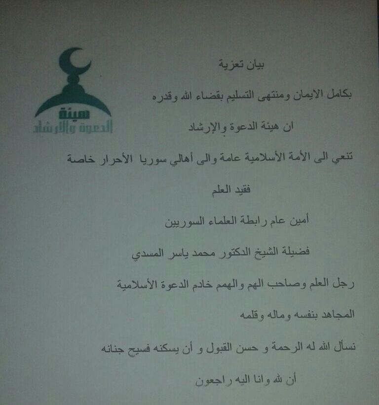 بيان تعزية من هيئة الدعوة والإرشاد بوفاة الشيخ محمد المسدي