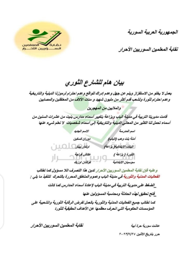 بيان نقابة المعلمين السوريين الأحرار حول تغيير أسماء مدارس في منطقة الباب إلى أسماء تركية