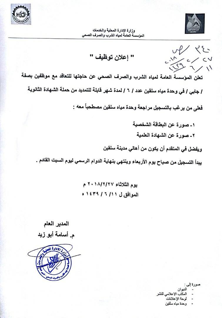 إعلان من المؤسسة العامة لمياه الشرب عن إجراء مسابقة لتوظيف عدد من الجباة