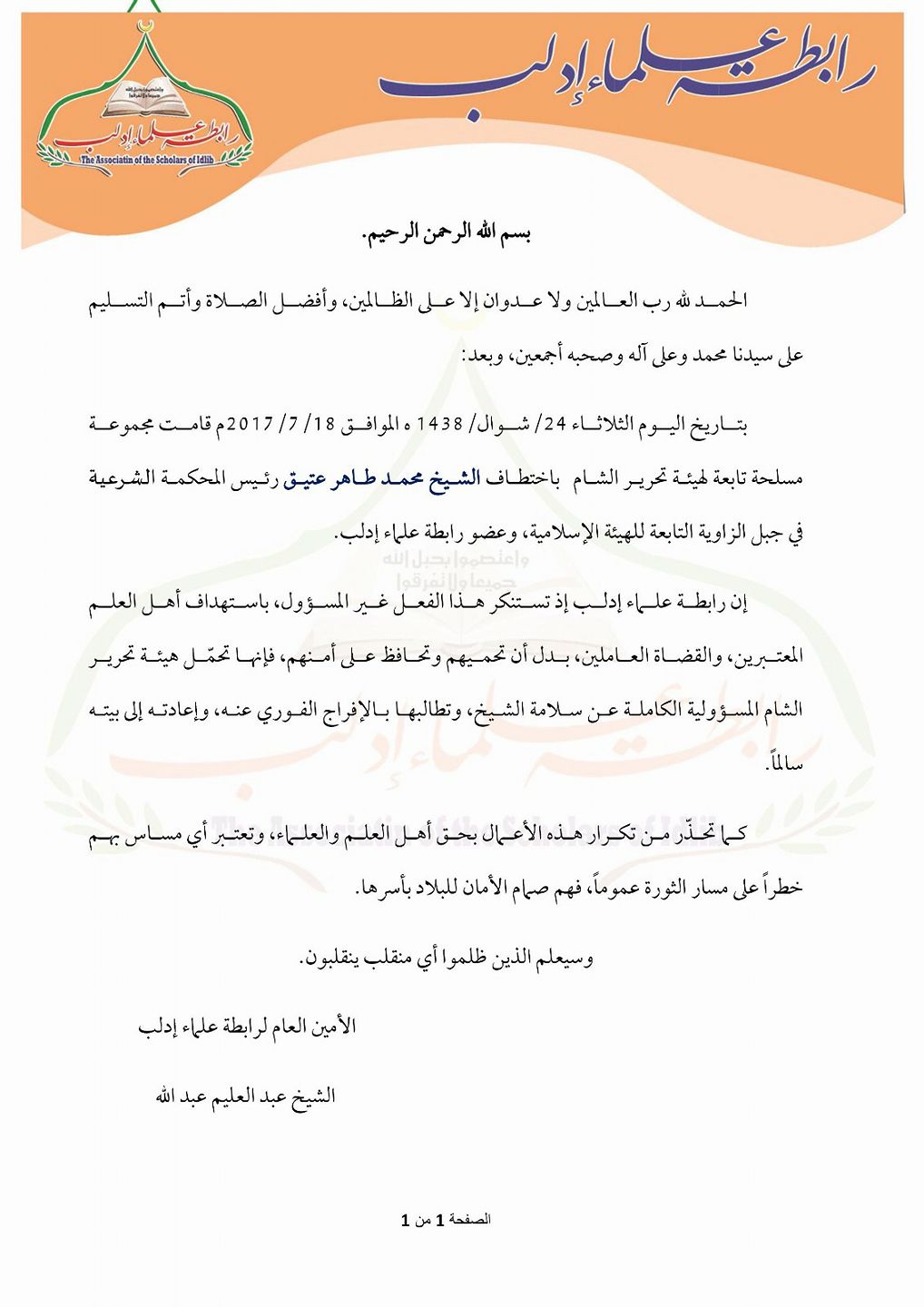 بيان استنكار من رابطة علماء إدلب لاختطاف الشيخ محمد طاهر عتيق من هيئة تحرير الشام