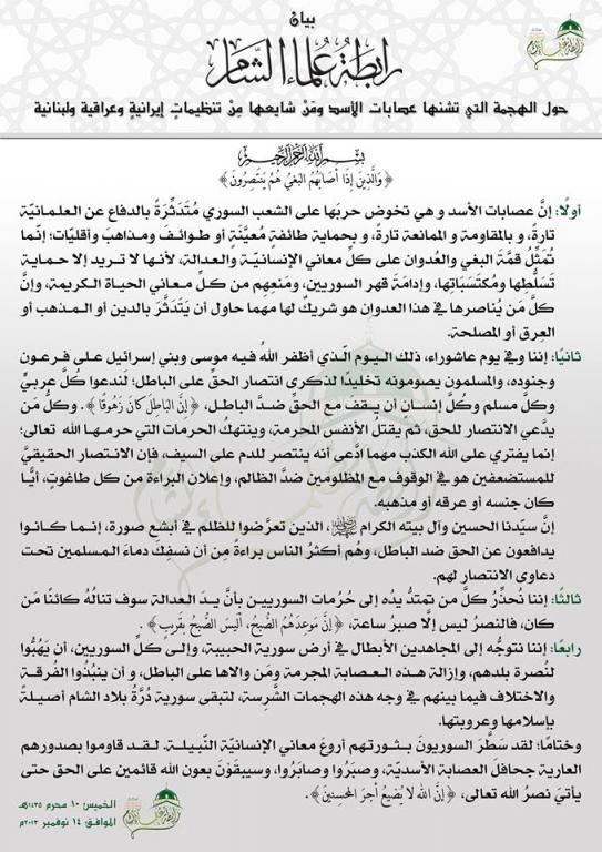 بيان رابطة علماء الشام بمناسبة يوم عاشوراء "حول الهجمة التي شنتها عصابات النظام ومن شايعها من تنظيمات إيرانية وعراقية ولبنانية"
