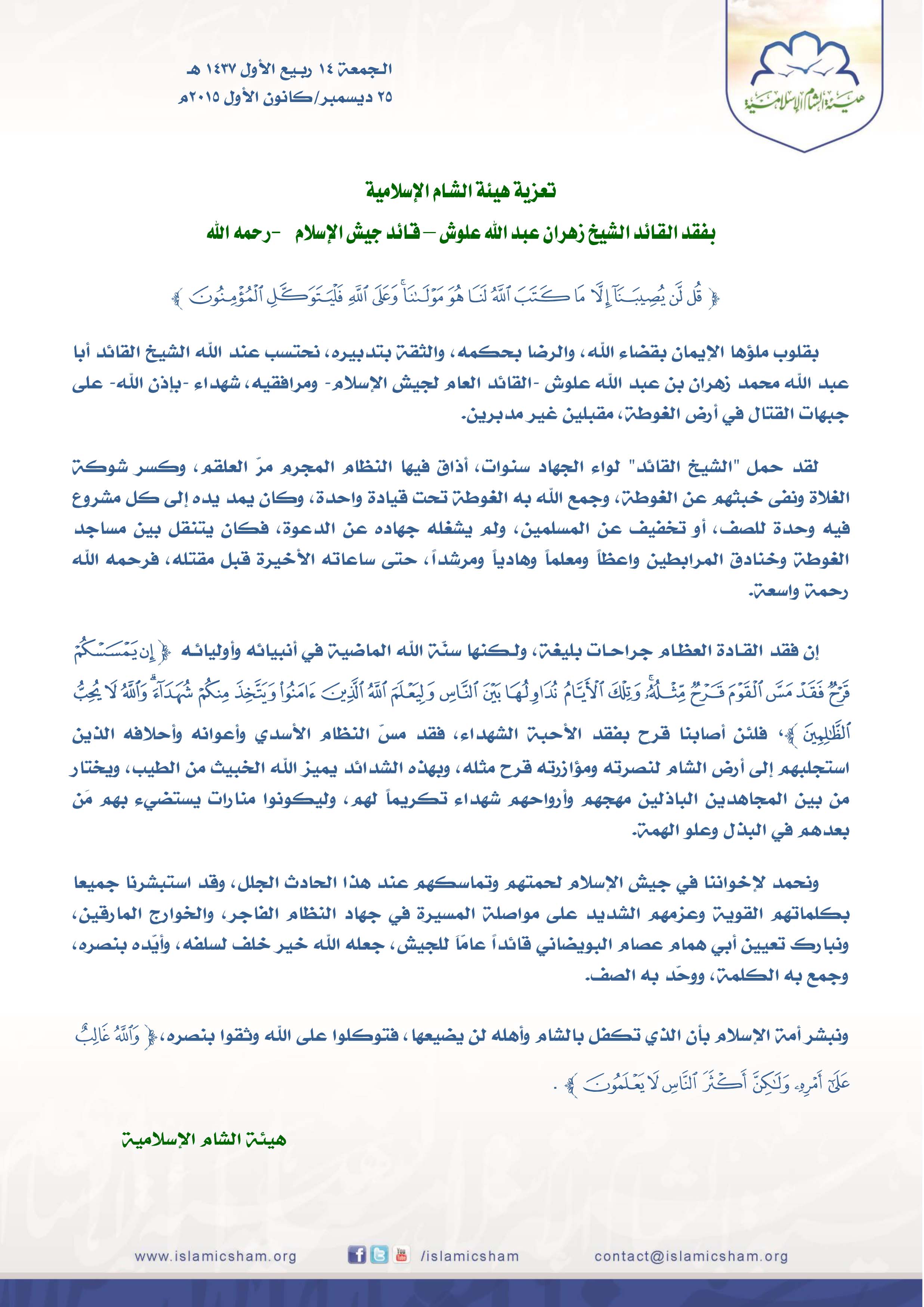بقلوب ملؤها الإيمان بقضاء الله، والرضا بحكمه، والثقة بتدبيره، نحتسب عند الله الشيخ القائد أبا عبد الله محمد زهران بن عبد الله علوش -القائد العام لجيش الإسلام- ومرافقيه، شهداء -بإذن الله- على جبهات القتال في أرض الغوطة، مقبلين غير مدبرين.