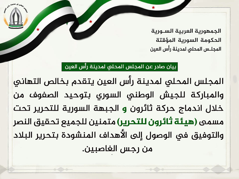 بيان من المجلس المحلي في رأس العين يهنئ فيه الجيش الوطني بتوحيد الصفوف وتشكيل هيئة ثائرون للتحرير