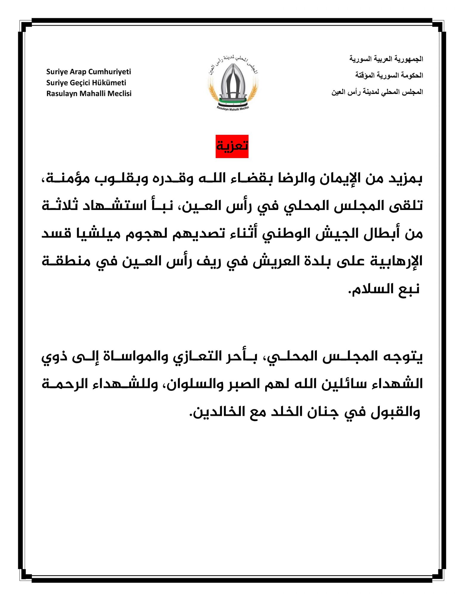 بيان من المجلس المحلي في رأس العين يعزي فيه الجيش الوطني بثلاثة من عناصره أثناء التصدي لميلشيا قسد