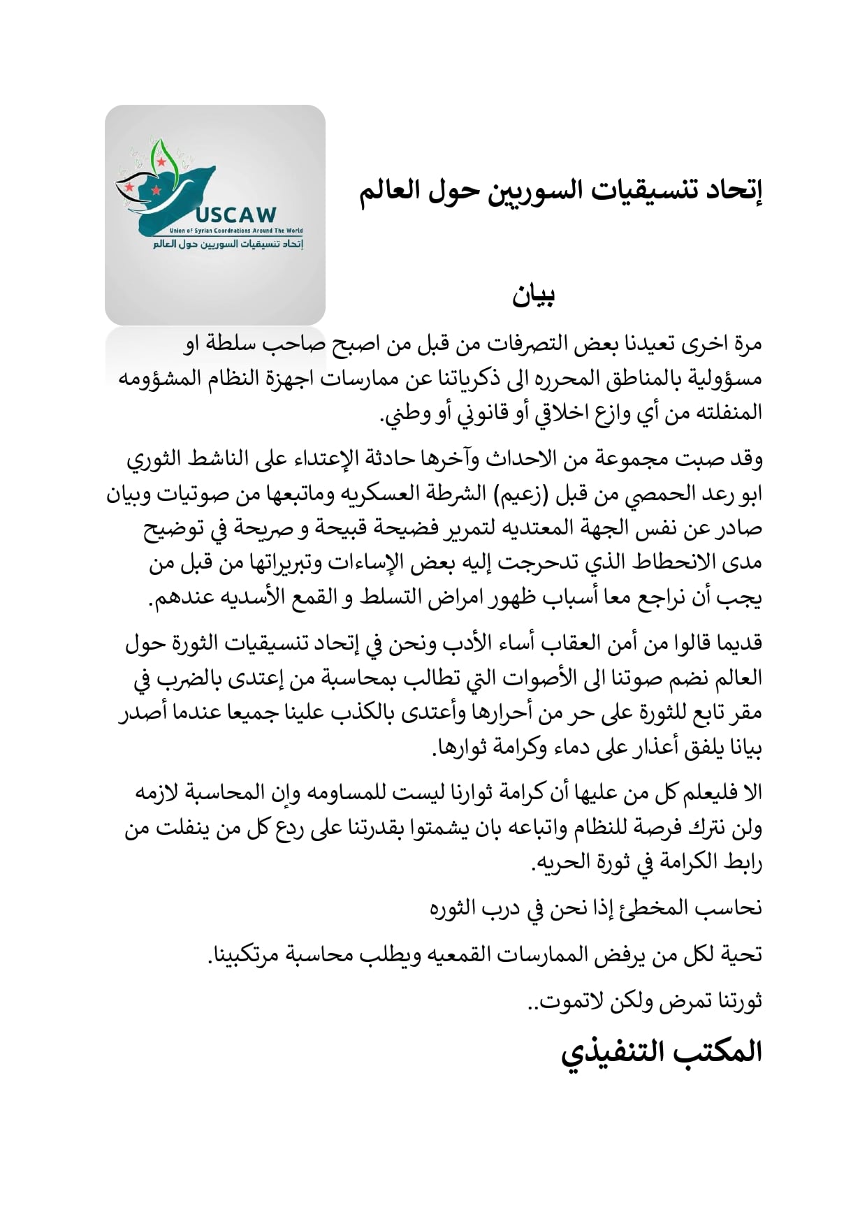قديما قالوا من أمن العقاب أساء الأدب ونحن في إتحاد تنسيقيات الثورة حول العالم نضم صوتنا الى الأصوات التي تطالب بمحاسبة من إعتدى بالضرب في مقر تابع للثورة على حر من أحرارها وأعتدى بالكذب علينا جميعا عندما أصدر بيانا يلفق أعذار على دماء وكرامة ثوارها.