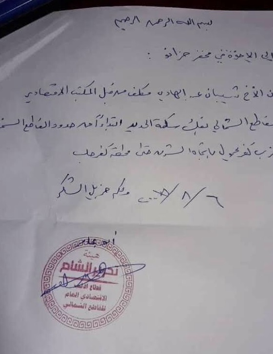 كتاب أمير القاطع الشمالي في هيئة تحرير الشام بتكليف أحد عناصرها بفك السكة الحديدية من كفريحمول إلى كفرحلب