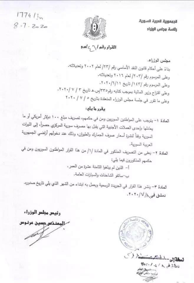 قرار مجلس الوزراء بإلزام المغتربين السوريين بتصريف 100 دولار بالسعر الرسمي أثناء دخولهم إلى سوريا