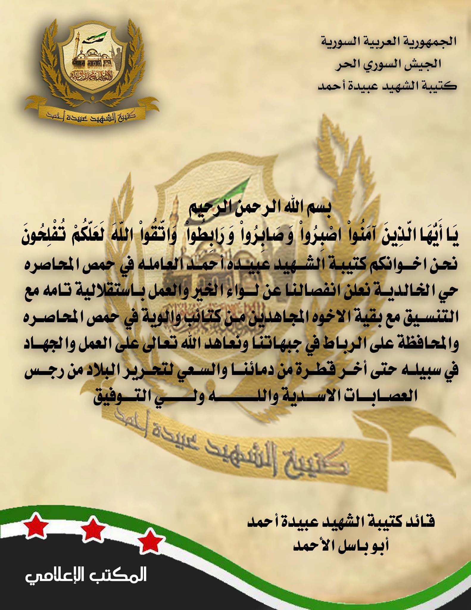 نحن اخوانكم كتيبة الشهيد عبيده أحمد العامله في حمص المحاصره - حي الخالدية نعلن انفصالنا عن لواء الخير والعمل باستقلالية تامه مع التنسيق مع بقية الاخوه المجاهدين من كتائب والوية في حمص المحاصره والمحافظة على الرباط في جبهاتنا ونعاهد الله تعالى على العمل والجهاد في سبيله حتى اخر قطرة من دمائنا والسعي لتحرير البلاد من رجس العصابات الاسدية والله ولي التوفيق